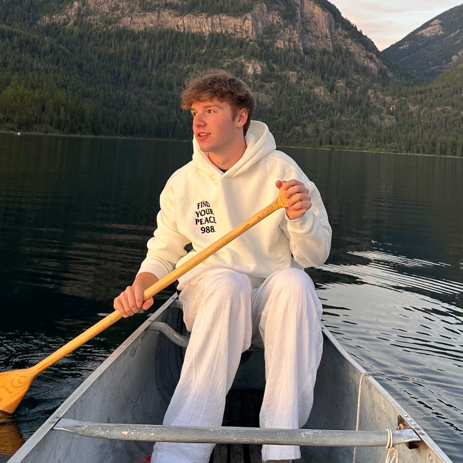 For me, peace has always come from the outdoors, whether I’m wakesurfing on the lake, backpacking, or hiking with friends. Those moments give me clarity and remind me of what really matters: living fully and sharing life with the people you love. I co-founded 988 to help others find that same sense of connection and hope. This brand is more than clothing, it’s a reminder to seek out your peace and a way to support mental health in our community.
